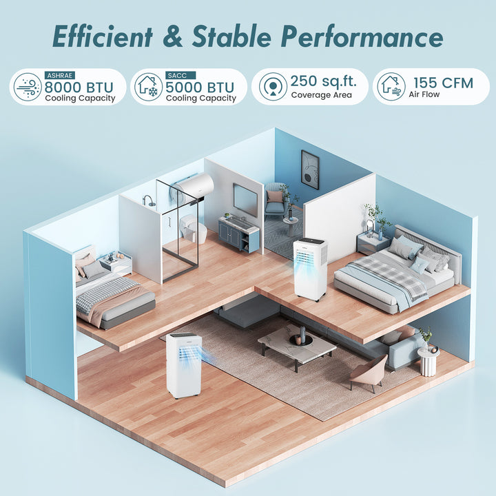 Powerful Cooling Function: With a cooling capacity of ASHRAE 8000 BTU/ SACC 5000 BTU, this portable air conditioner can maintain room temperatures between 61¨H to 88¨H. The 120¡ã swing function ensures efficient cooling for spaces up to 250 sq.ft, including living rooms, offices, dining rooms, and study areas.