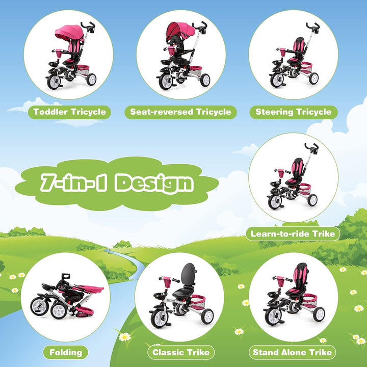 7-In-1 Multifunctional Design: This baby tricycle converts into seven different modes: push stroller, infant pram stroller, push trike, training trike, balance trike, classic trike, and folding trike. It supports your child's development from 12 to 50 months, making it a valuable long-term investment.