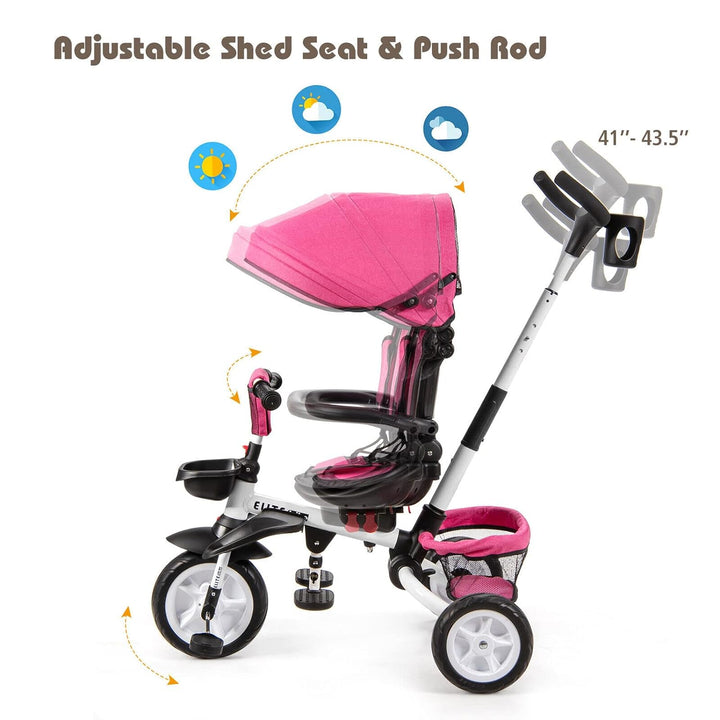 Adjustable Canopy and Push Handle: The large adjustable canopy offers protection from the sun with different angle settings. The height-adjustable push handle allows parents to easily control the tricycle's steering and speed. The push bar can also be removed for kids to enjoy independent riding.