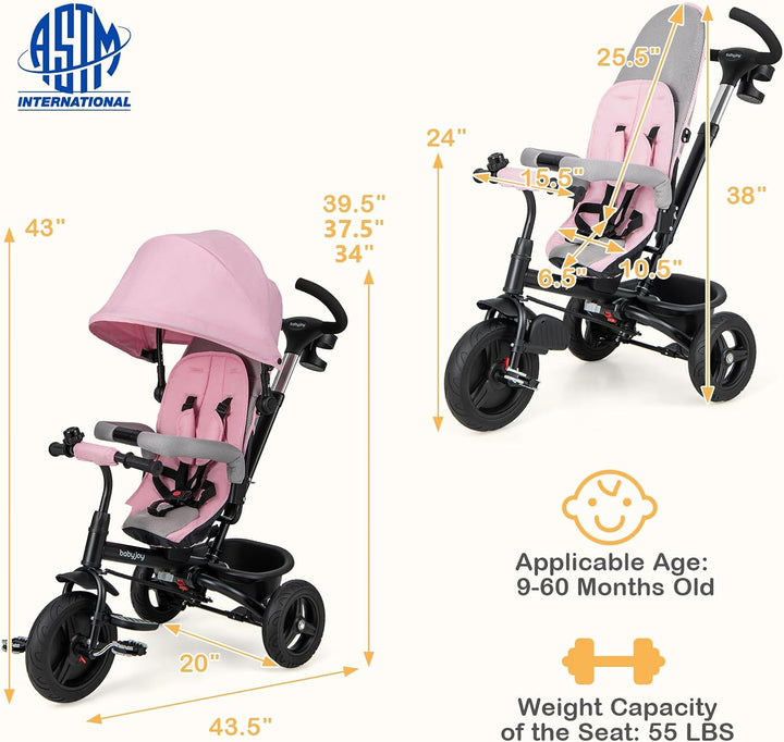 4-In-1 Multifunctional Design: Easily converts into a seat-reversed trike, a push tricycle, or a learn-to-ride tricycle. This tricycle adapts to your child's growth stages, making it suitable for ages 9 to 60 months. The seat supports up to 55 lbs.