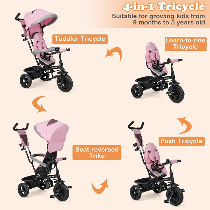 4-in-1 Detachable Toddler Tricycle: This multifunctional tricycle can be easily converted into four different modes: toddler tricycle, seat-reversed trike, push tricycle, or learn-to-ride tricycle. It features a detachable canopy, seat cushion, guardrail, and push handle, making it suitable for kids aged 9 months to 5 years. The seat has a weight capacity of 55 lbs.