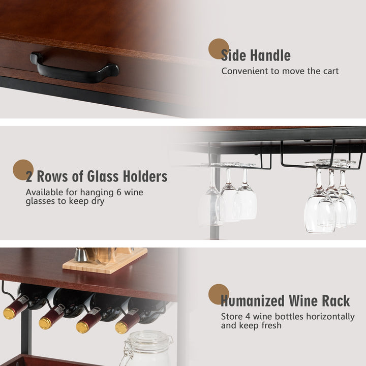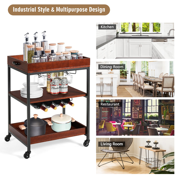 3 Tiers Kitchen Island Serving Bar Cart with Glasses Holder and Wine Bottle Rack