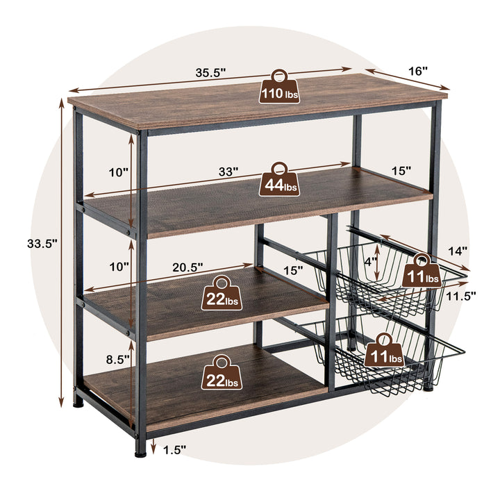 Spacious Storage Space: The rack features a generous countertop and multiple shelving options, providing ample room to store daily essentials. Each of the two wire baskets can safely hold up to 11 lbs, ideal for fruits or vegetables.