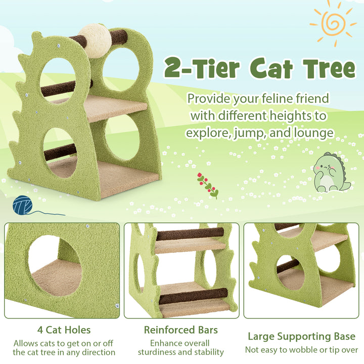 Adorable and Stylish Appearance: Featuring a vibrant green and warm beige color scheme, this small cat tree is designed in an adorable dinosaur shape. It not only serves as a fun activity center for your cat but also adds a stylish touch to your home decor with its compact footprint.