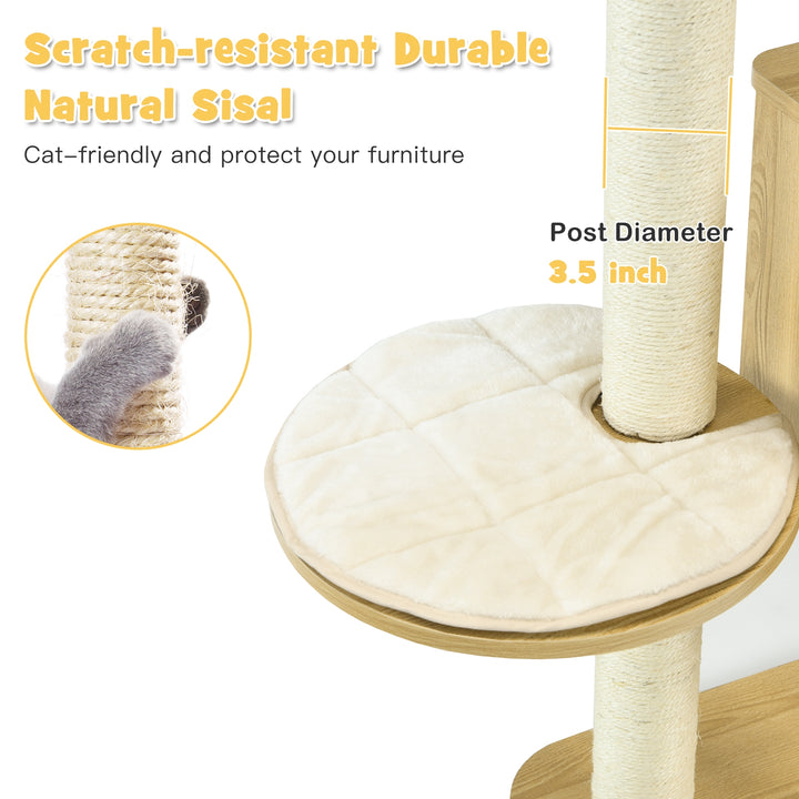 Complete Sisal Coverage for Scratching: Unlike other cat trees, every pillar of our cat activity tree is fully wrapped with natural sisal rope, catering to your cat's instinctual scratching and climbing desires. This feature helps to develop healthy scratching habits while keeping your furniture safe from damage.
