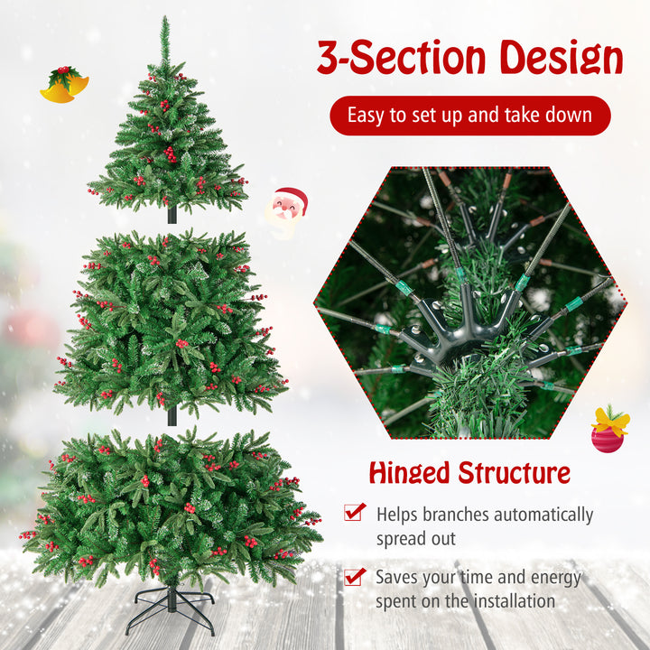 Vivid and Luxurious Appearance: The tree features 1363 dense branch tips with a mix of PVC and PE leaves, creating a realistic and festive look. It is adorned with 84 clusters of red berries and sparkling silver powder, adding vibrant charm to your holiday decor.