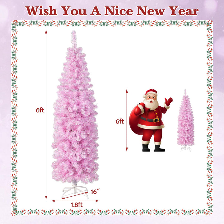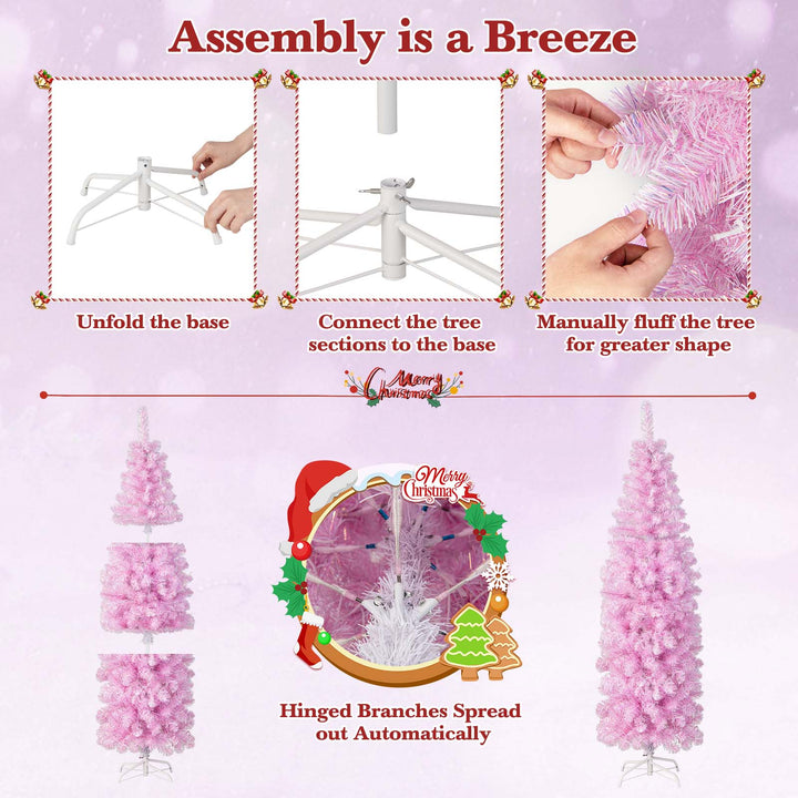 Exquisite Holiday Decor: Featuring a vivid and realistic treetop with 343, 475, or 670 glossy pink and interspersed white leaves, this Christmas tree provides a fascinating and luxurious look. Its unique pencil design allows it to fit seamlessly into any corner of your home.
