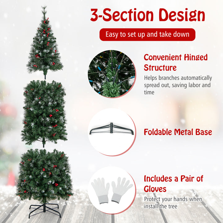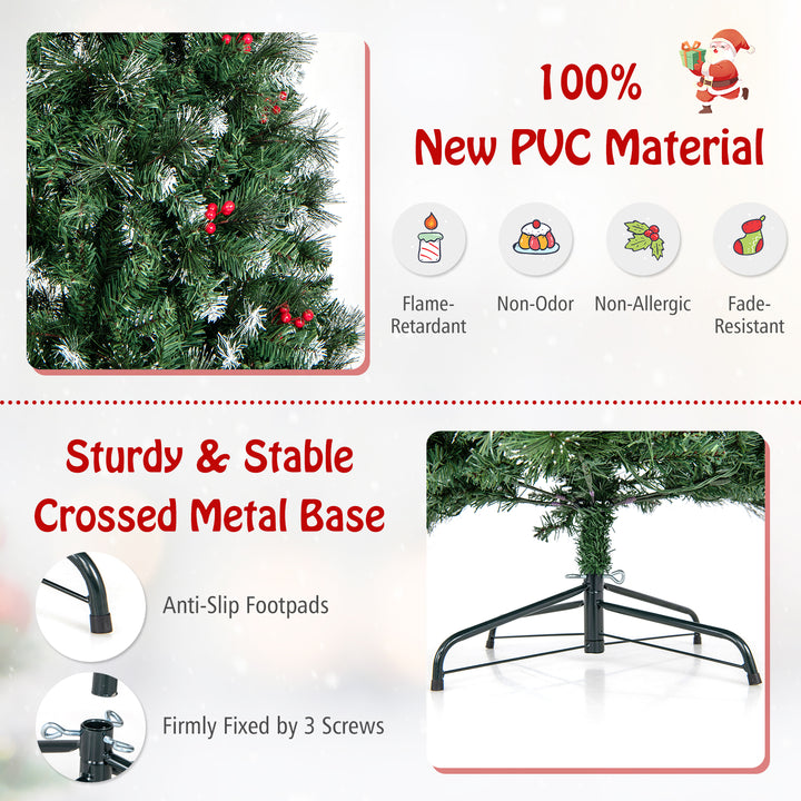 Luxurious and Lifelike Appearance: The slim pencil artificial Christmas tree, available in 5/6/7/8/9 ft sizes, boasts 408/618/818/1168/1298 lush branch tips crafted from snowy PVC leaves and pine needles with silver glitter. It's also adorned with 28/37/46/55/62 clusters of vivid red berries, adding a natural and festive touch to your home.