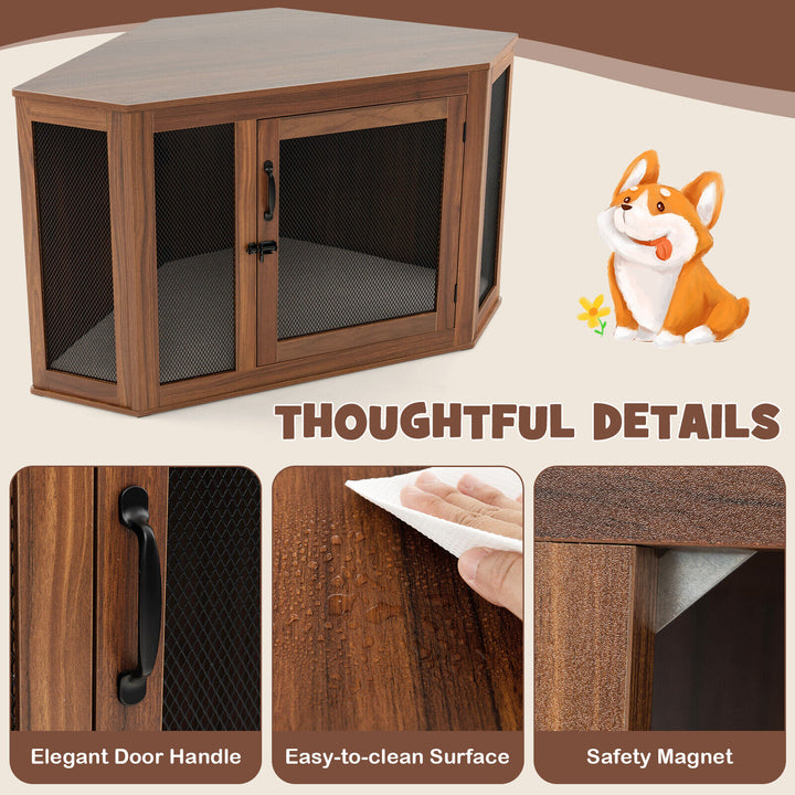 Introducing our Elegant Corner Dog Crate, an innovative and stylish solution designed to seamlessly integrate into your living space while providing a cozy and secure area for your furry friend. Perfectly shaped to fit into any corner, this dog crate combines functionality with elegance, saving space without compromising on style. The simulated wood grain design adds a touch of sophistication, making it an ideal piece of furniture that enhances your home decor.
