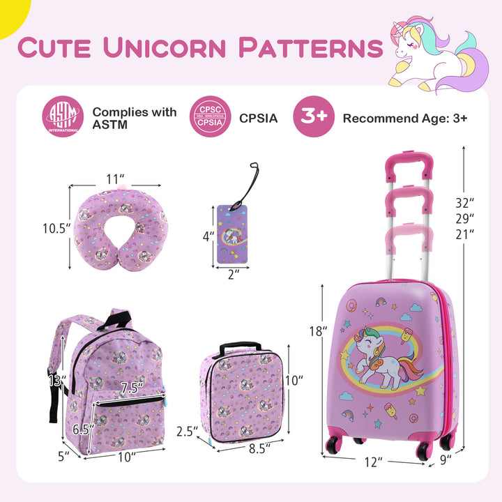 All-Inclusive Kids Luggage Set: This delightful 5-piece set features a soft velvet-covered neck pillow for superior comfort, ensuring peaceful relaxation on the go. The waterproof lunch bag allows your child to enjoy fresh food anytime. The included name tag makes it easy to label the suitcase for quick identification.
