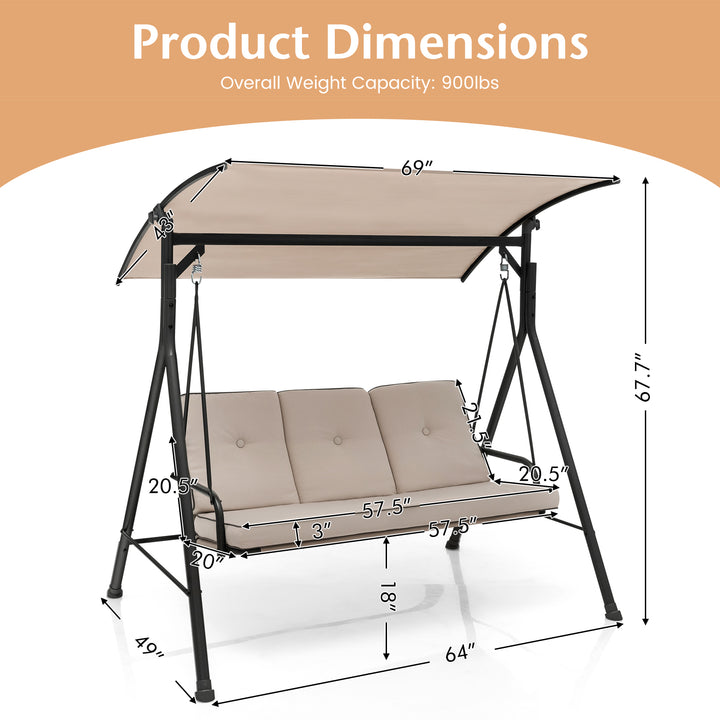 3-Person Outdoor Porch Swing with Adjustable Canopy and 900 Lbs Weight Capacity