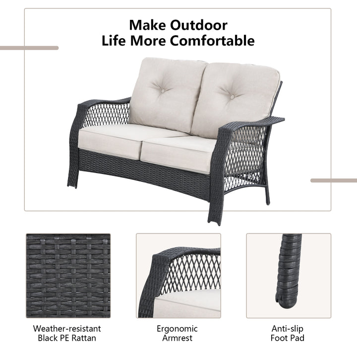 Transform your outdoor living space into a haven of comfort and versatility with our 4-piece patio furniture set. Designed to adapt to your changing needs and outdoor spaces, this set includes a spacious loveseat, a functional coffee table with a storage shelf, and two ergonomic single chairs. Whether you're outfitting a garden, backyard, poolside, or any other outdoor area, this set provides the perfect combination of style, comfort, and functionality.