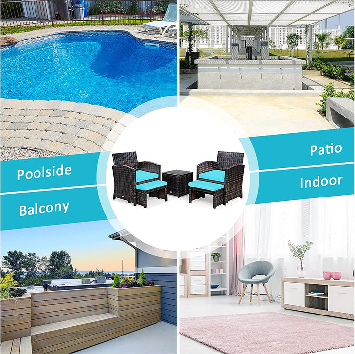 5 Pieces Patio Rattan Furniture Set with Ottoman and Tempered Glass Coffee Table