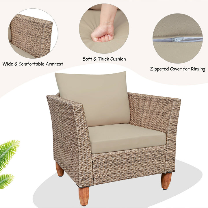 Elevate your outdoor living space with our Modern Patio Furniture Set, blending durability, comfort, and style to create the perfect outdoor retreat. This meticulously crafted set features a robust steel frame wrapped in weather-resistant wicker, complemented by solid wood feet for added stability and elegance. Designed with your comfort in mind, this set includes ergonomically shaped sofas and a chic acacia wood top table, making it an ideal choice for gatherings or relaxing evenings outdoors.