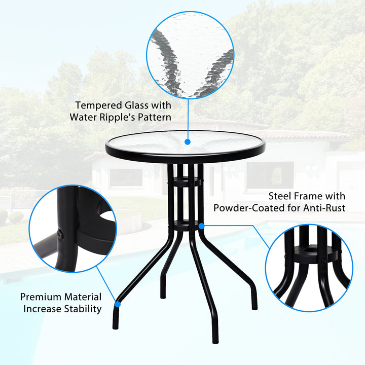 Durable Construction: Built to last, the chairs feature sturdy, powder-coated steel frames that are rust-proof and suitable for outdoor use. The Textilene material offers UV protection, aging resistance, and wear resistance. The table is constructed with quality materials, including a tempered glass top for added durability and stability, highlighted by its unique leg design.