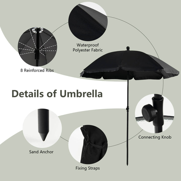 Versatile 71" Umbrella with 45¡ã Tilt Design: Complementing the set is a waterproof and sun-protection umbrella, designed with a 45¡ã tilt feature to block sunlight efficiently from various angles. Its spiky bottom inserts into the sand effortlessly, while a sturdy connection ensures safe use. A strap is included for easy storage when not in use.
