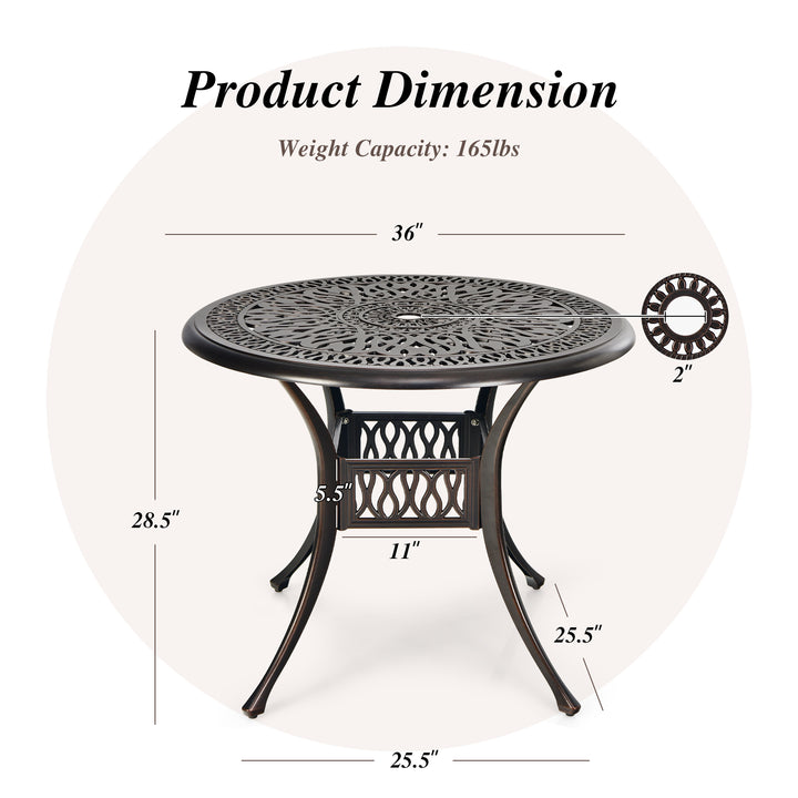 Durable Cast Aluminum Construction: Built to last, the table is made from high-quality cast aluminum with a powder-coated finish for enhanced rust resistance. A solid retaining ring underneath the tabletop adds to the structural integrity, ensuring the table remains stable and secure through years of enjoyment.