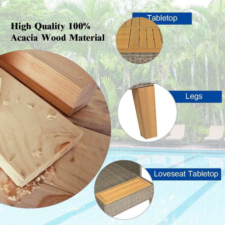 Versatile Seating and Storage: Featuring two loveseats, a single sofa, and a coffee table, this sectional set provides ample seating for up to five guests. Integrated storage areas beside the loveseats and an acacia wood tabletop coffee table offer convenient space for drinks, snacks, and essentials, keeping everything you need within reach.