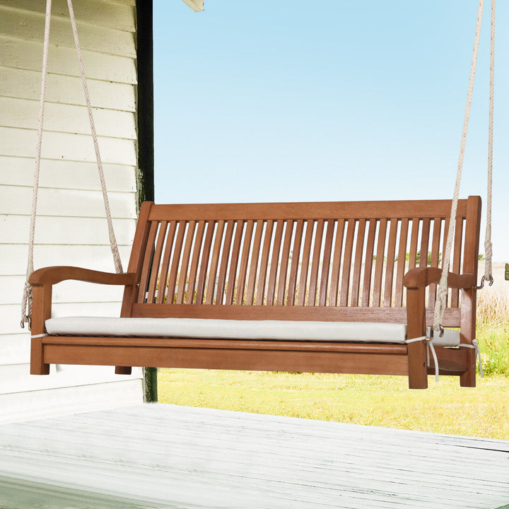 2-Person Hanging Porch Swing Wood Bench with Cushion Curved Back