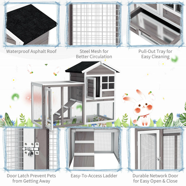 Introduce your furry friends to a world of comfort and freedom with our Deluxe 2-Story Rabbit Hutch. Crafted from natural fir wood and coated with waterproof, non-toxic varnish, this rabbit hutch stands out for its durability, safety, and cozy living quarters for your pets. Equipped with a weatherproof asphalt roof, it ensures your pets stay dry and comfortable in any weather condition. The thoughtful design includes a snug raised house for rest and a spacious running box for play, connected by a safe ramp. Featuring all-round wire fences for security and air circulation, along with lockable doors for easy access, this hutch promises a happy and healthy lifestyle for your pets.