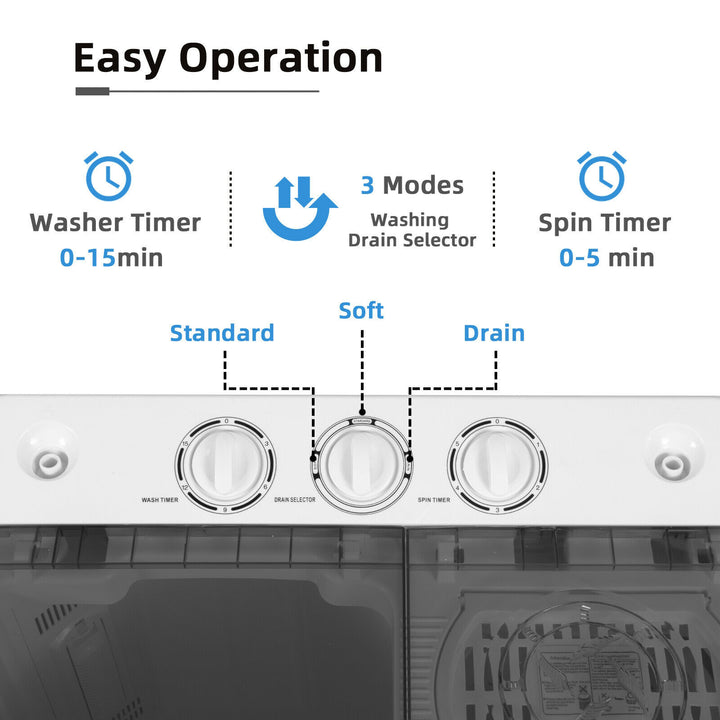 Timer Control and Easy Operation: Equipped with separate timer controls for washing and spinning. The washer timer runs up to 15 minutes, while the spin timer runs up to 5 minutes. Includes soft, standard, and drain modes to suit different fabric types.