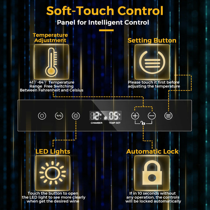 Intuitive Soft-Touch Controls: Featuring a user-friendly control panel, our wine cooler simplifies operation. Easily adjust settings or illuminate your collection with the built-in LED light. A safety lock activates after 10 seconds of inactivity, ensuring settings remain unchanged, particularly in households with children.